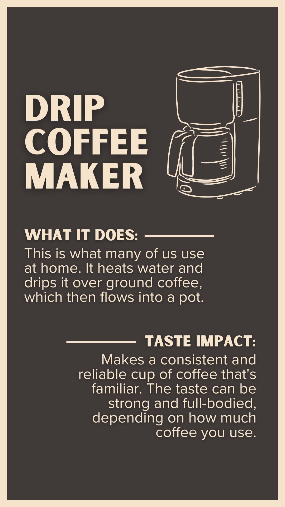 Drip coffee makers come in all different shapes and sizes. Our measurements are based on the standard drip machine you would use for your home. We use 60 grams of medium ground coffee and 1,000 grams of water. The brew time will typically be around 4 minutes. All variables such as measurements and brew time can change based on your machine and the coffee pot size so it's recommended to do individual research on your machine.