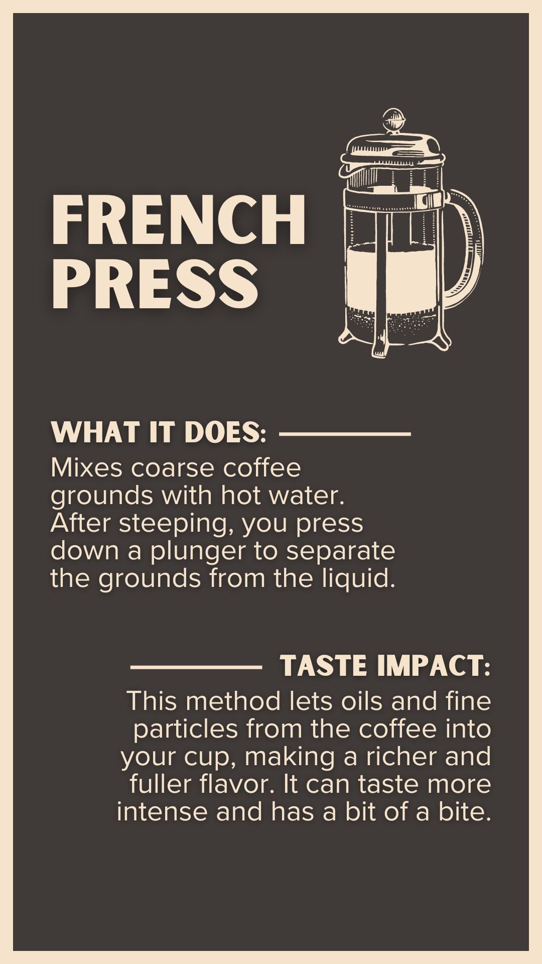 Our in house method uses 34 grams of medium ground coffee. We use 500 grams of coffee heated up to around 190-210 degrees. The total time for this brew method is 3-4 minutes. Adjustments can be made depending on personal preference and the coffee being used.